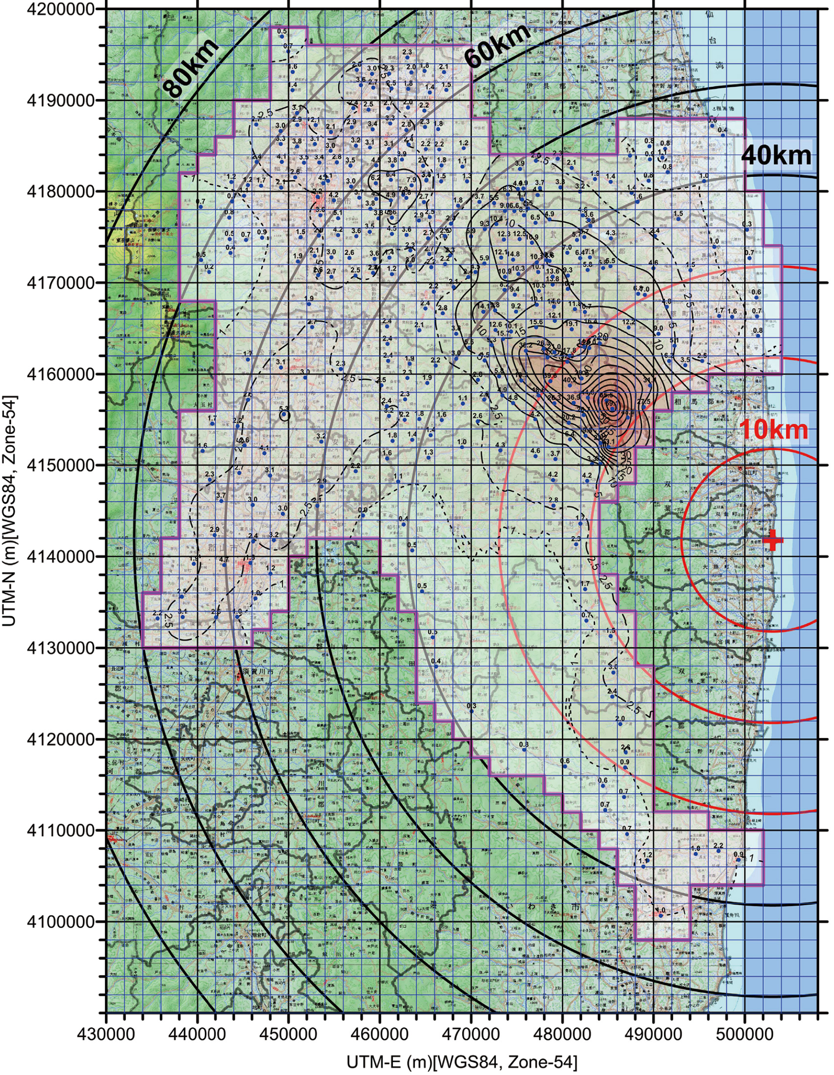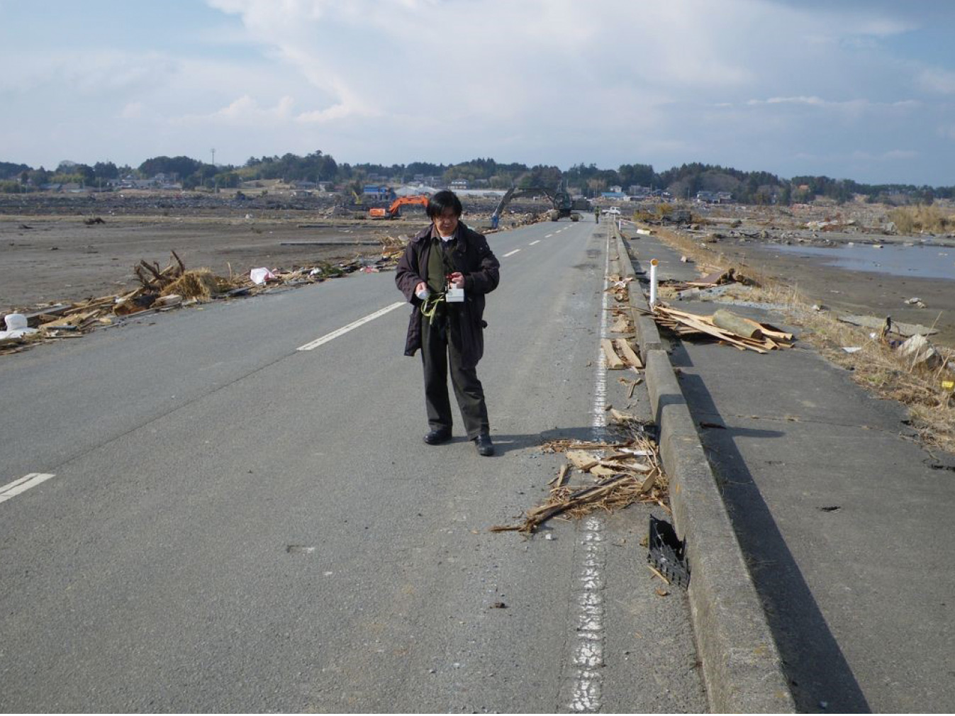 2011年3月11日の東日本大震災に引き続いて起こった、東京電力福島第一原子力発電所の事故直後には、福島県内の放射線量に関する情報はごく断片的なものしかありませんでした。そこで共生システム理工学類では3月19日に有志の教員20名あまりが集まり、原発事故被災地域にある大学の理系研究者として専門の枠を越えて連携し、自ら現地に赴いて放射線量測定をはじめることになりました。当時は充分な数の測定器もなく、移動に使用する自動車のガソリンも限られ、また津波の被害が生々しく残っている中での調査でした。3月末にその結果をまとめた放射線量マップによって、線量の高いエリアが北西方向に広がっていることがはじめて明らかになりました。この調査結果は政府の避難地域の再設定や福島県の災害対策の基礎データとして用いられることになりました。