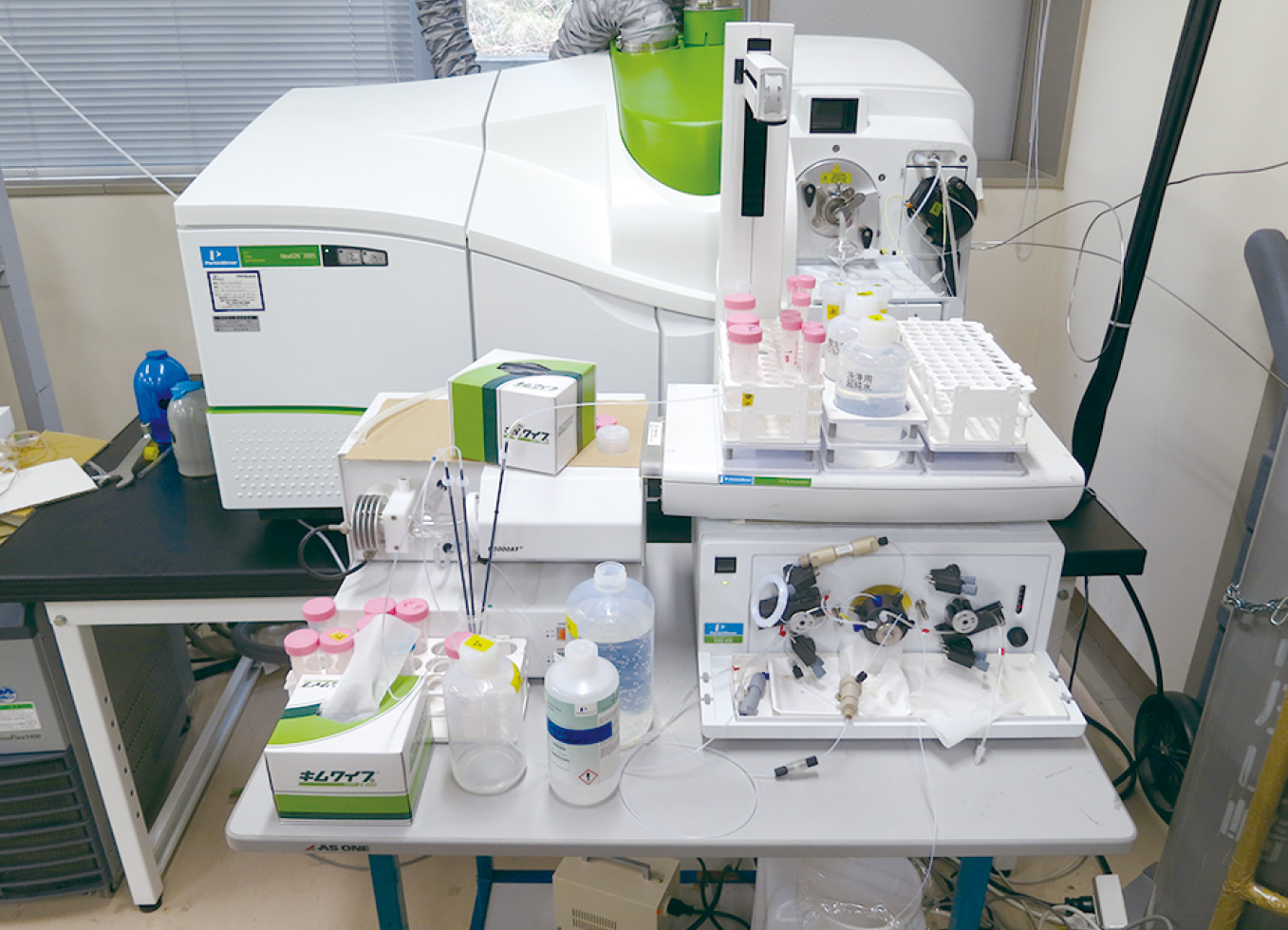 プラズマによりイオン化させた原子の質量を測定する装置です。ストロンチウムなどの放射性物質の同定などにも使います。