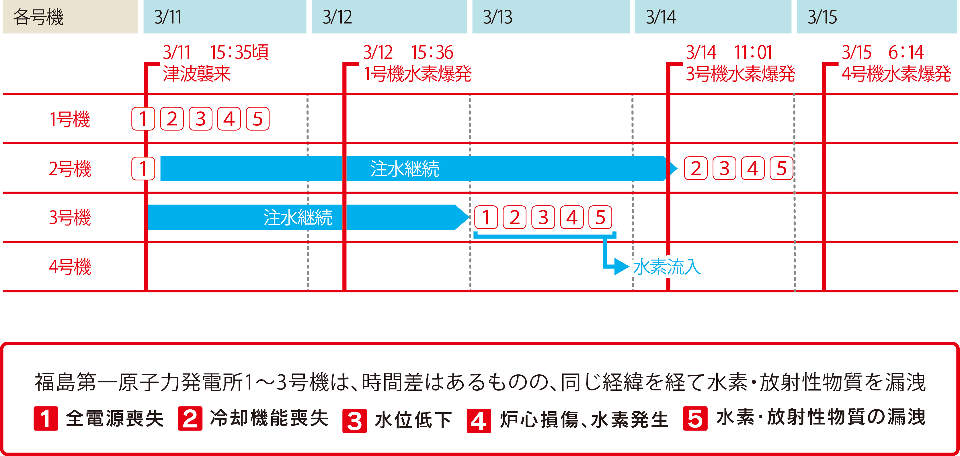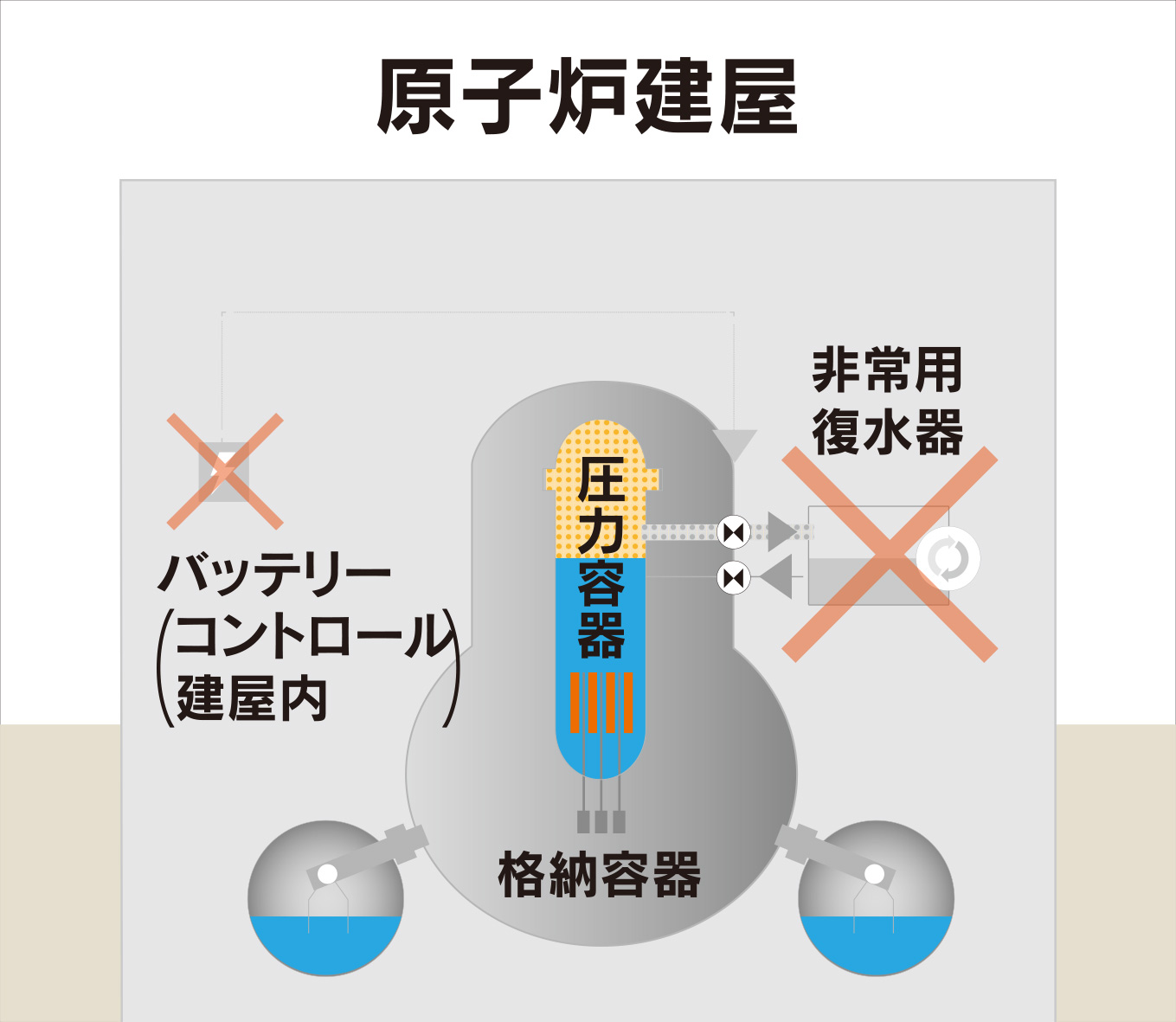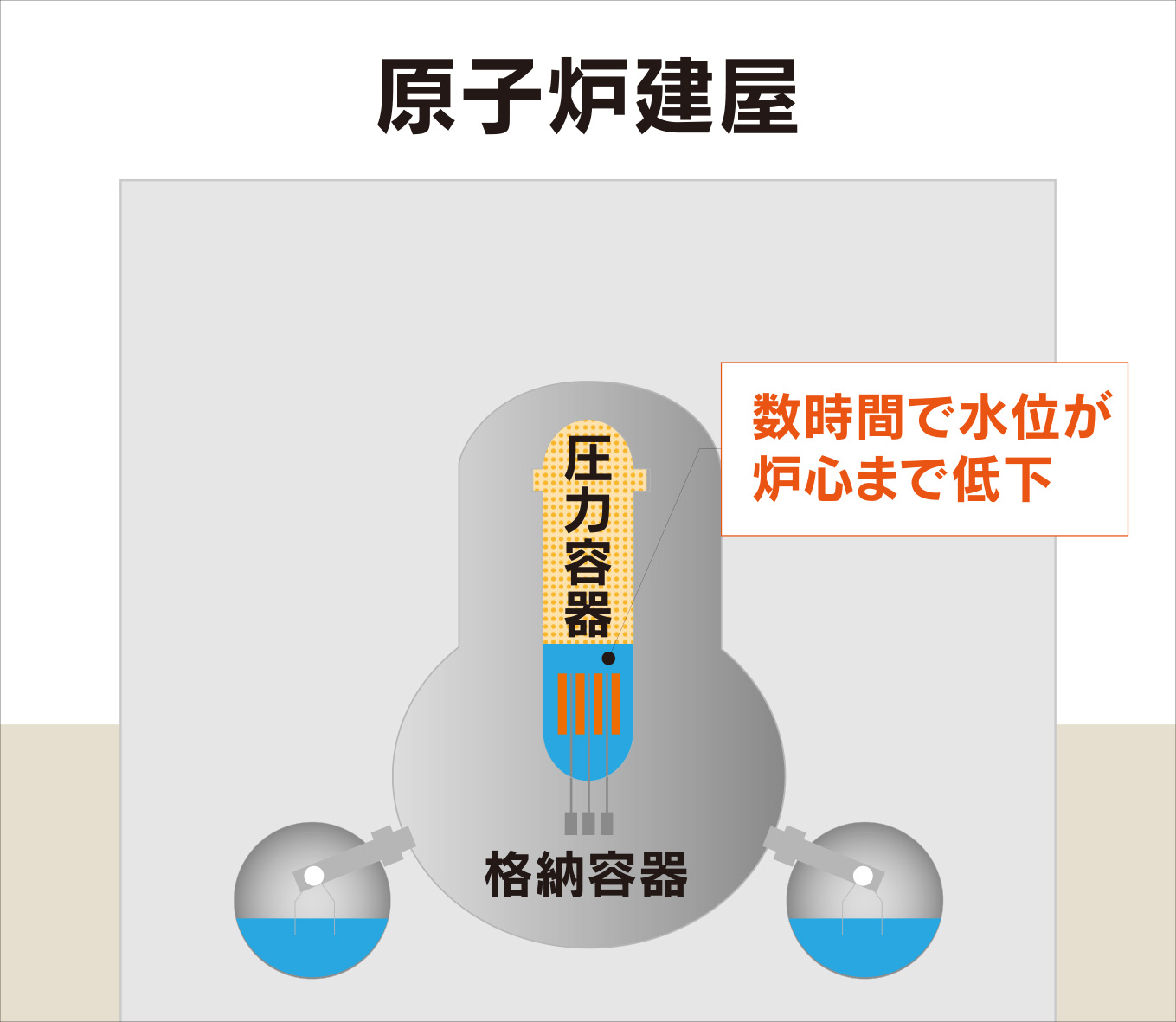緊急停止から5時間後でも定格熱出力の1%程度の熱が発生しています。これは数分で1トンの水を蒸発させるほどのエネルギーです。原子炉停止後も膨大な熱が発生するために冷やし続ける必要があります。
