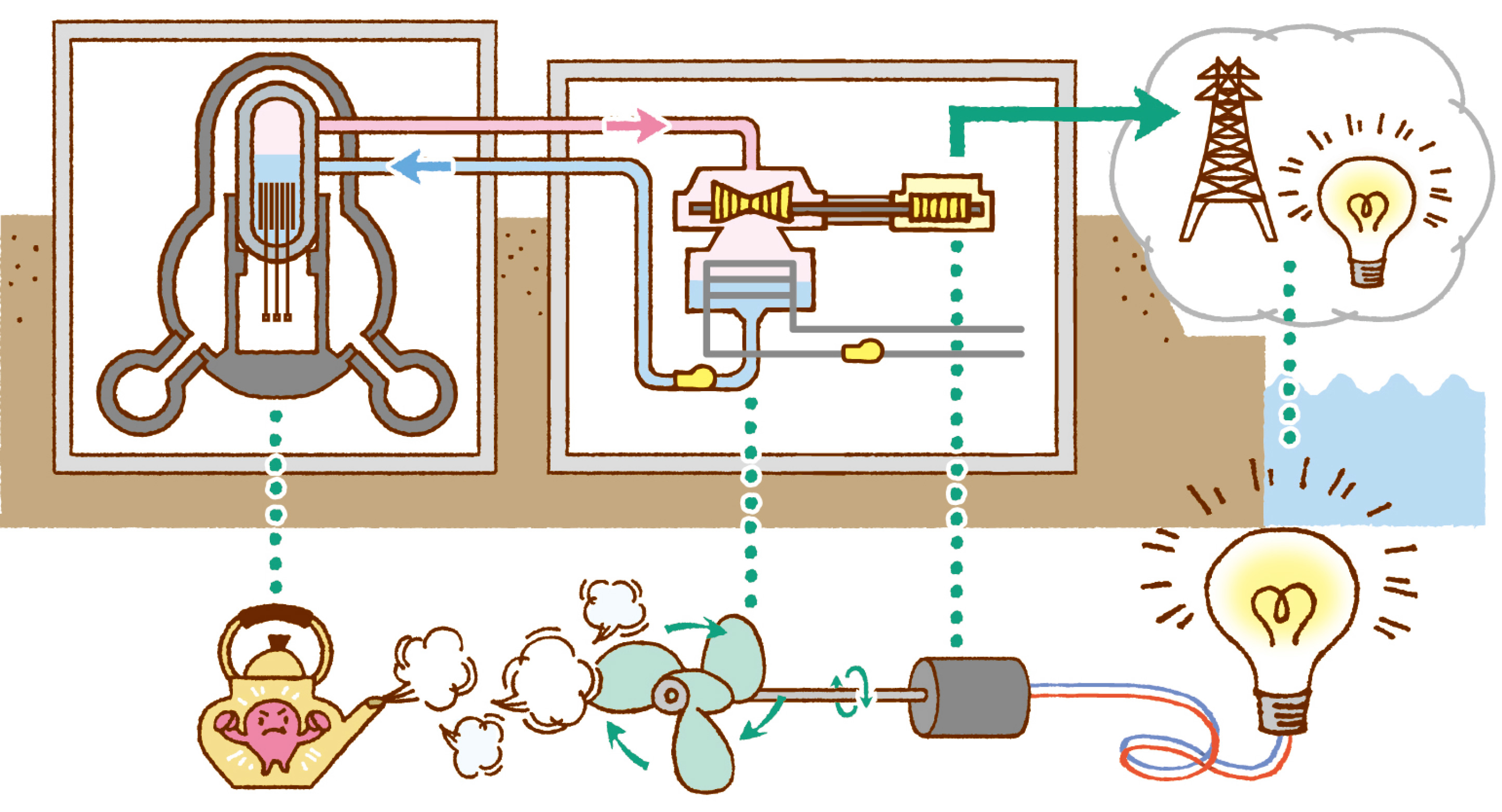 ウランが核分裂する時に発生する高熱で水を蒸気にします。その蒸気でタービンを回します。タービンに接続された発電機が回転し、発電します。蒸気は冷やして水に戻します。