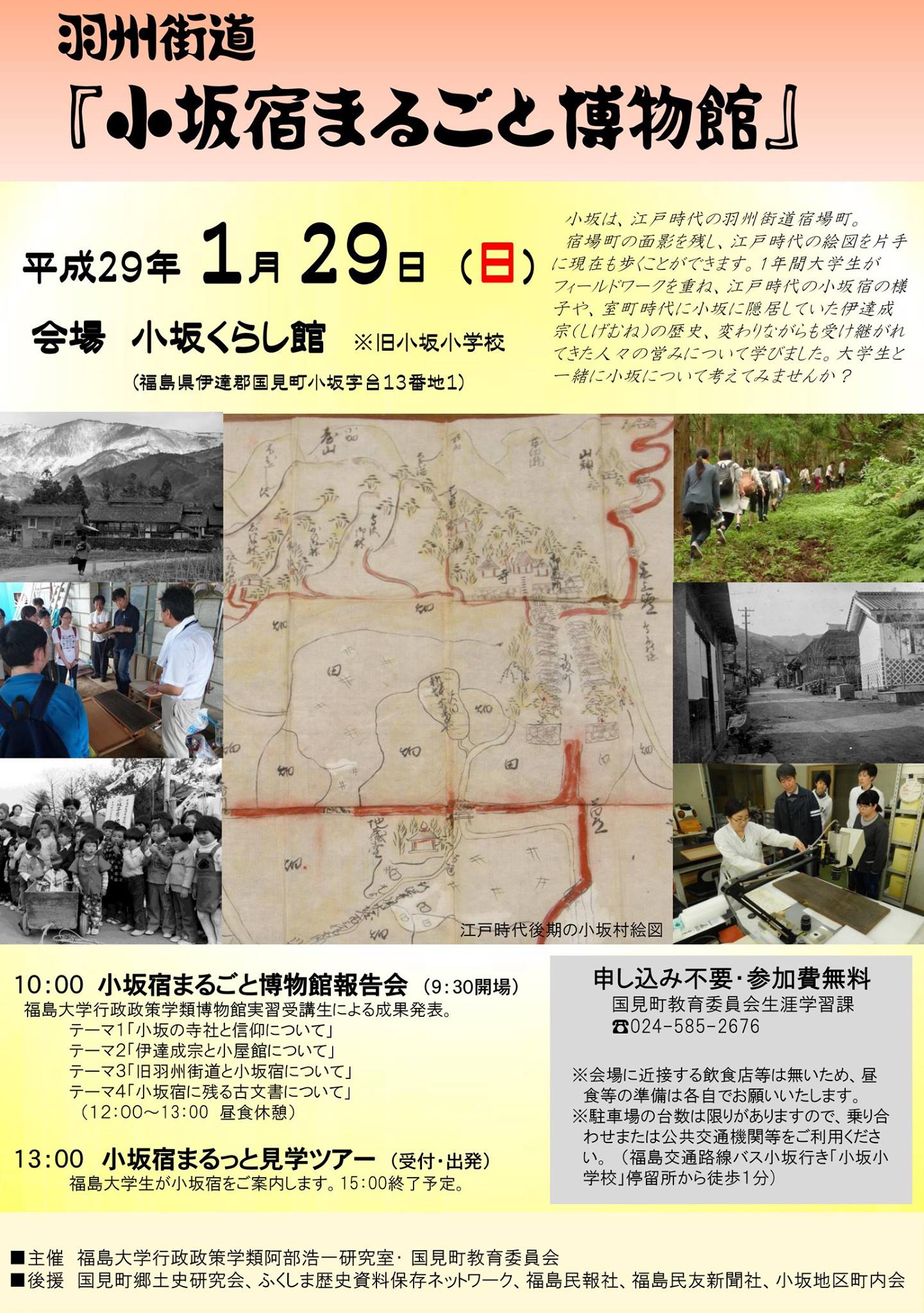 2017年01月29日(日曜日)に,福島大学行政政策学類阿部浩一研究室と国見町教育委員会が主催する羽州街道「小坂宿まるごと博物館」が,小坂くらし館(旧小坂小学校,国見町)で行われます。詳しくは,コチラをご覧ください。