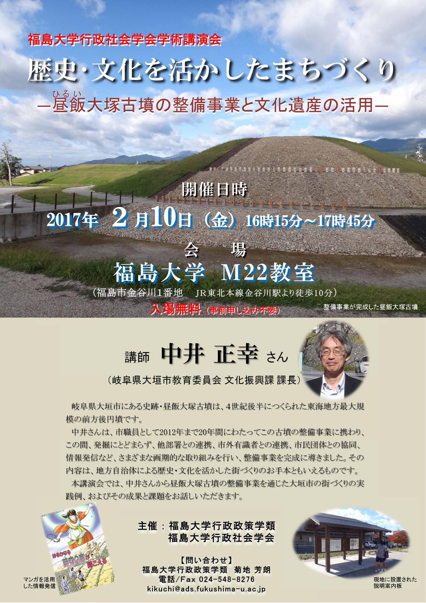 2017年02月10日(金曜日)に,福島大学行政政策学類,福島大学行政社会学会が主催する学術講演会「歴史・文化を活かしたまちづくり-昼飯大塚古墳の整備事業と文化遺産の活用-」が,福島大学金谷川キャンパス(福島市)で行われます。詳しくは,コチラをご覧ください。