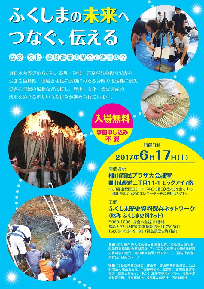 しまの記憶」展が2015年9月26日~10月6日9:30~16:30(※開催初日は10:30開始のオープニングセレモニー後に開場)に福島大学うつくしまふくしま未来支援センター 3・4階リフレッシュルーム(http://fure.net.fukushima-u.ac.jp/)で開催されます。初日の9月26日に行われる記念シンポジウム「ふくしまの震災関連資料の保全と活用」では阿部浩一が司会を務めます。