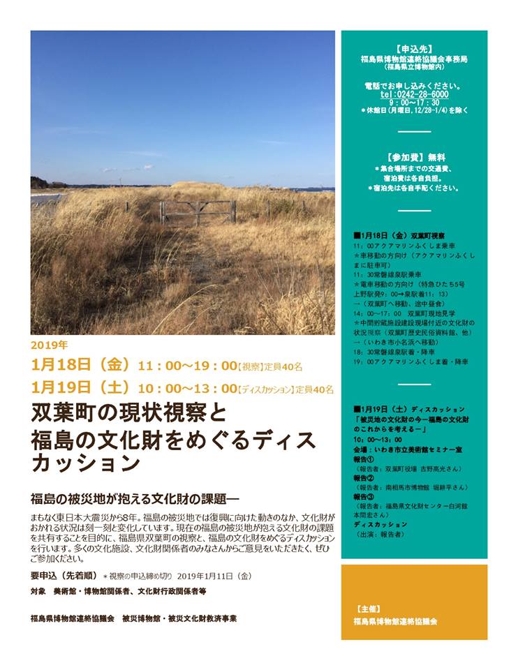 2017年2月17日(金曜日)~19日(日曜日)に,はま・なか・あいづ文化連携プロジェクト実行委員会が主催する現地視察ツアー「福島・文化・文化財~被災地のミュージアムと文化財のこれから~」が行われます。詳しくはコチラをご覧ください。