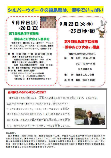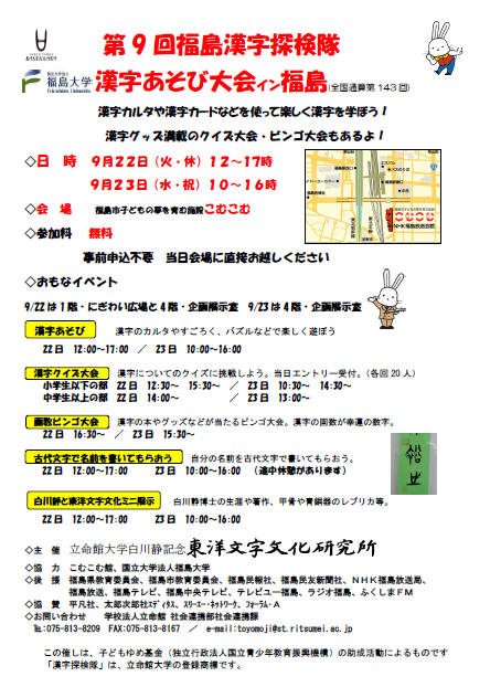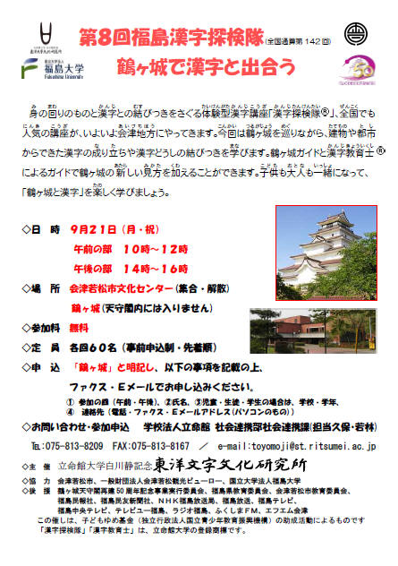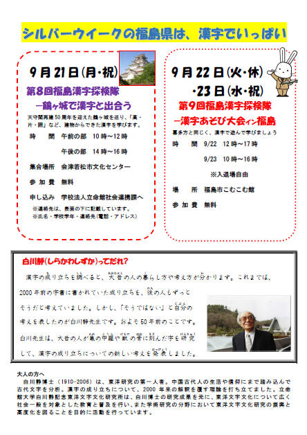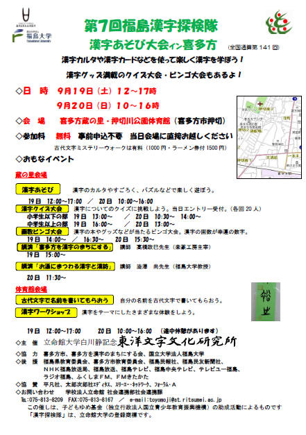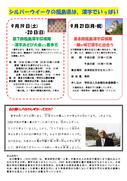 福島漢字探検隊2015 福島大学・立命館大学「漢字で元気に」プロジェクト第5弾として2015年9月19~20日に漢字あそび大会in喜多方「蔵の里で漢字と遊び・漢字を究める!」,21日に漢字探検隊in会津若松「鶴ヶ城で漢字と出会う!」,22~23日に漢字あそび大会in福島「こむこむで漢字と遊ぼう!」が行われます。さらに,喜多方市で9月20日に行なわれる講演会「お酒にまつわる漢字と漢詩の世界」で澁澤尚が講演いたします。