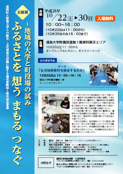 2016年10月22日(土曜日)~30日(日曜日)に,富岡町および福島大学うつくしまふくしま未来支援センターが主催する企画展「ふるさとを 想う まもる つなぐ ~地域の大学と町役場の試み」が,福島市の福島大学付属図書館で開催されます。また,22日(土曜日)には,シンポジウム「なぜ地域資料を保全するのか」が行われ,福島大学の徳竹剛が基調講演を,パネルディスカッションでは福島大学の阿部浩一がコーディネーターを務めます。詳しくはコチラをご覧ください。