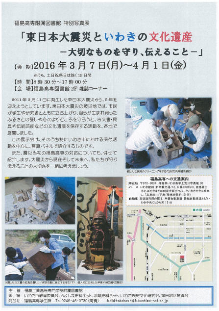 特別写真展「東日本大震災といわきの文化遺産―大切なものを守り,伝えること―」が2016年3月7日~4月1日に福島高専図書館で行われます。
