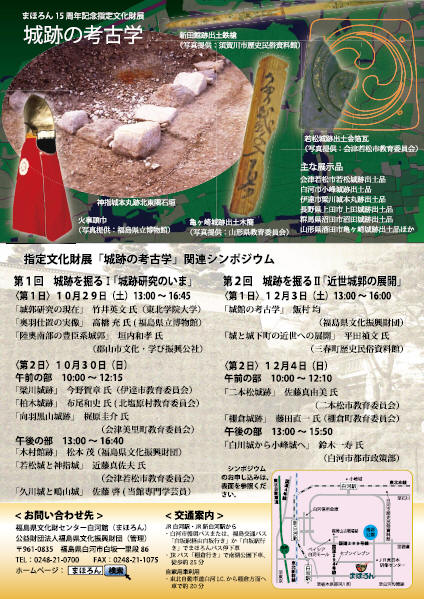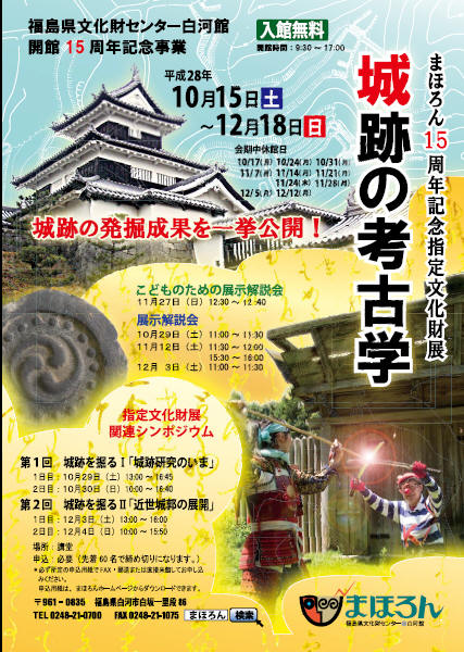 10月15日(土曜日)~12月18日(日曜日)に,福島県文化財センター白河館 まほろん開館15周年記念指定文化財展「城跡の考古学」および関連シンポジウムが,白河市の福島県文化財センター白河館 まほろんで行われます。詳しくはコチラをご覧ください。