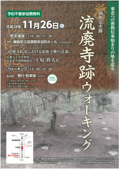 11月26日(土曜日)に,棚倉町教育委員会が主催する歴史講座「山林寺院史における流廃寺跡の意義」が,棚倉町立図書館多目的ホールで行われます。また,流廃寺跡を巡るウォークングも行われます。詳しくはコチラをご覧ください。
