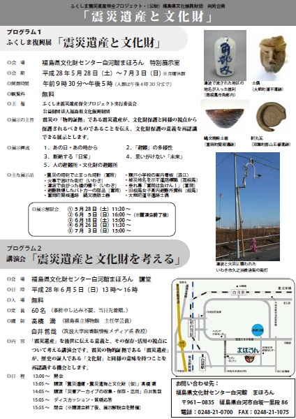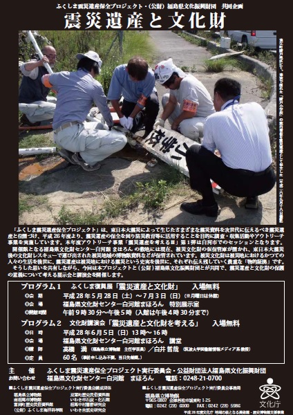 ふくしま震災遺産保全プロジェクト実行委員会・公益財団法人福島県文化振興財団主催の「震災遺産と文化財」展が,2016年5月28日(土曜日)~7月3日(日曜日)まで白河市の福島県文化財センター白河館 まほろんで開催される予定です。また,6月5日(日曜日)には,文化財講演会「