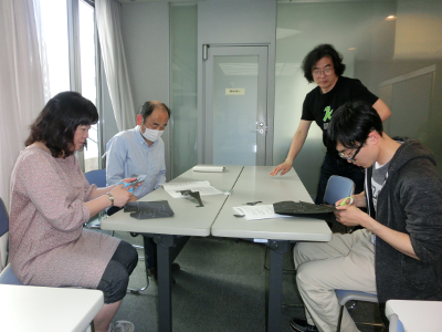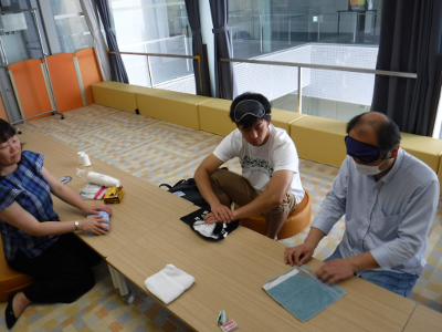 アイマスクをつけて自分の持ってきたタオルを当ててみるという課題をやってみました。写真は,課題の終了後,それぞれがどのような手がかりで,自分のタオルを探したかについて語り合っているところです。