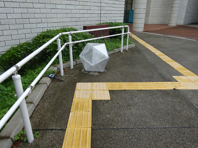 この一件,学生・留学生課に問題を伝えたところ対応が迅速であった。翌日の段階で,大型のオブジェは,左写真のように完全に点字ブロックにかからない位置に移動されており,小型のオブジェも,許容の範囲と言える位置に移動されていた。なお,小型のオブジェの方の移動位置について,許容の範囲と評しているのは,右伝いで図書館方向に向かう視覚障害者にとっては邪魔な位置ではあるものの,そもそも点字ブロックの敷設の仕方が不適切で,右伝いで図書館方向に向かうことが非常に困難なためである。