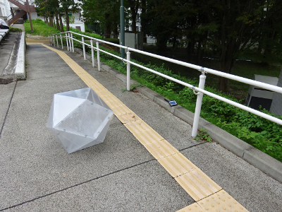 このようなものを設置すること自体に文句はない。問題なのは,設置場所だ。左側の写真のものは,点字ブロックをまたぐ形で本体と固定部が設置されており,その間がワイヤーでつながれているため,この点字ブロックを使って,S棟と行政政策が学類棟の間を行き来することが出来なくなっている。また,右側の写真のものは,点字ブロックに近接させすぎて配置しているため,点字ブロックを右伝いで利用する人が図書館から駅に向かって進行する際に,大きな支障となる。