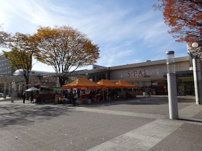 In warm autumn Sunday at the station square of Fukushima Station, a market event where autumn foodstuff were sold were held. Many people were gathered.
