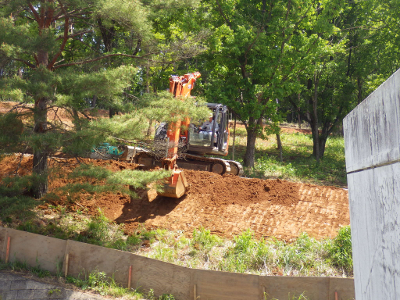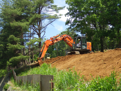 The arm of the power shovel hit the branch of a pine tree so many times.
