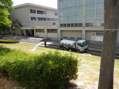 in front of the gymnasium using spraying lorry. I've never seen such scene