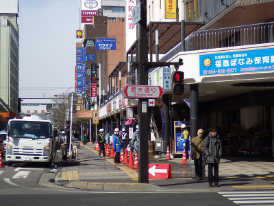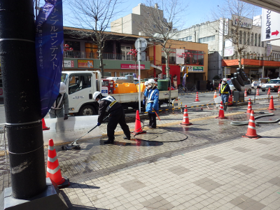 震災からちょうど4年のこの日,福島駅からまちなか広場に続く道路の除染作業が行われていた.