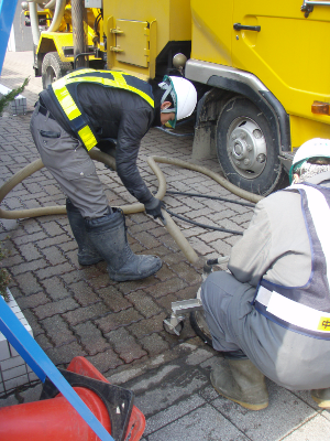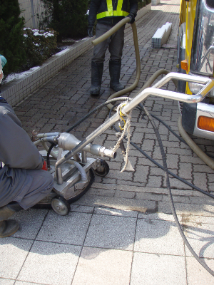 At a main street, cleaning of a sidewalk with a high pressure water jet machine