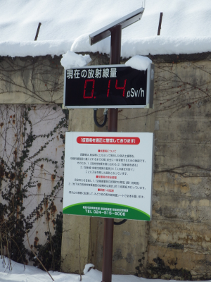 仮置場の脇に設置されたモニタリングポストによると,この日の放射線量は0.14μSv/hであった.(写真右)