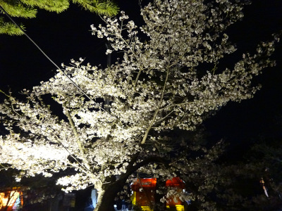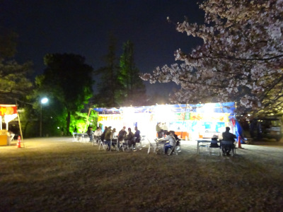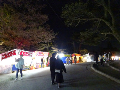 Although the cherry blossoms in Mt. Shinobu began to fall, many visitors came to the parking area in front of the Gokoku Shrine to enjoy nocturnal view of cherry blossoms.