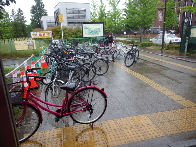 よりは自転車の数は少ないが,それでも,点字ブロックの上に自転車が停められている。前日より自転車の数が少ない分,点字ブロックの上に駐輪されている様子が,確認しやすいかもしれない。