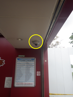 防犯カメラは,右端の写真の黄色い丸で示した,以前から設置されていたエスカレータを監視している(と私が思っていたもの)1台のみだ。新たにカメラが増設されたわけではないので,「防犯カメラ作動中」という掲示は,はったりだと思っている人もいるのかもしれない。興味あるところだ。