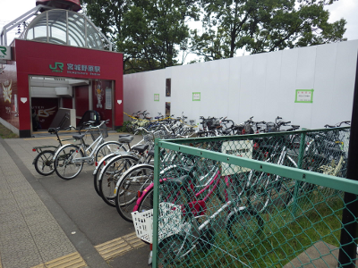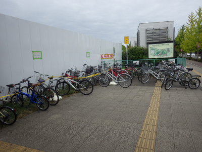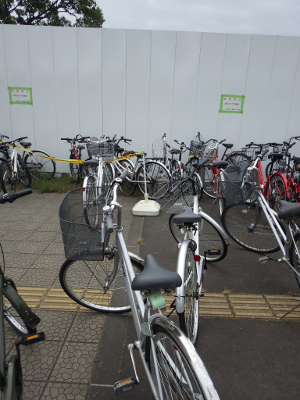 台風の影響で午後から雨が降るという天気予報のこの日,宮城野原駅前に違法駐輪された自転車の数は,前日と比べると少し多いものの,普段と比べると若干少ない感じであった。点字ブロックの上に置かれた自転車の数は,いつもより数台少ない感じである。