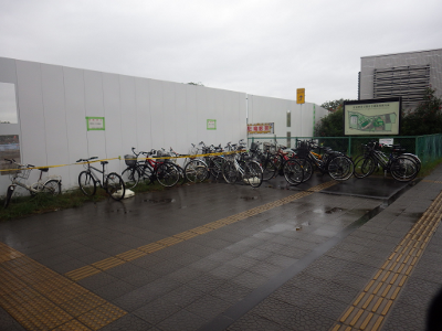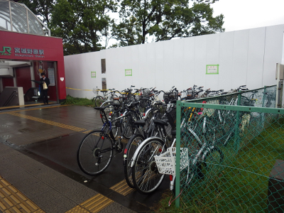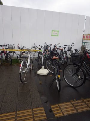 雨が降る日曜の朝,いつも通りの時間に宮城野原駅前に通りかかったところ,少ないながらも違法駐輪された自転車があった。これだけ少ない数の自転車しかなくても,点字ブロックの上に堂々と自転車を停めているものがいる。