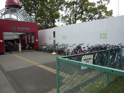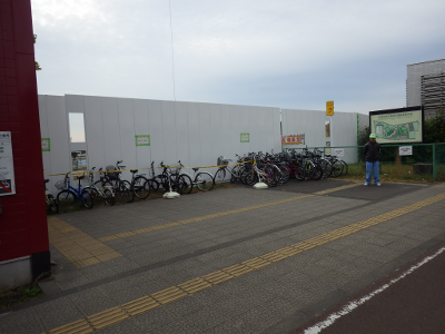 この日は,宮城野原駅前に仙台市委嘱の自転車誘導員が立っていた。おそらくそのためであろう,違法駐輪された自転車の数は,いつもと比べて明らかに少ない。そして,点字ブロックの上には1台も自転車が停められていない。