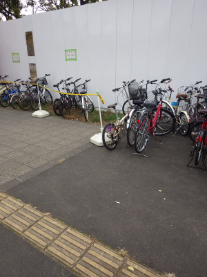 駐輪禁止であることを知らせるテープを張る支柱は,10月26日から変わらず,壁から自転車1台分の位置に置かれていた。