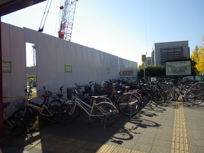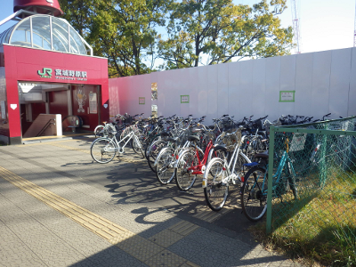 よく晴れた土曜の午前,宮城野原駅前に違法駐輪された自転車の数は,平日の朝と比べて非常に多い。それに伴い,点字ブロックの上に置かれた自転車の数も,平日の朝より多い。