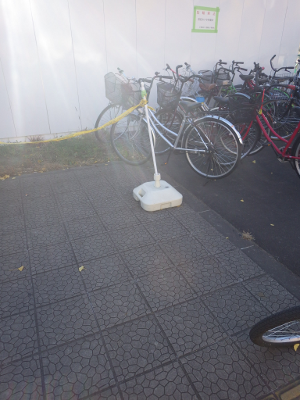駐輪禁止であることを知らせるテープを張る支柱は,前日と同様に位置である。そして,このテープはこの日も見事に結界を作り上げていた。その結果として,駅から離れた側に,集中的に自転車が置かれる状況となっている。晴眼者の駅の利用という観点からは,駅前が広く空いているに越したことはないので,よい対策なのかもしれない。しかし,このように自転車が置かれた結果,点字ブロック利用にとって邪魔な自転車の数は,増えているように見える。したがって,ここでの一番の問題である「点字ブロックが利用できない」ということに対しては,対策になっているどころか,逆効果であると評せざるを得ない。JRの担当者には,テープの張り方の再考をお願いしたい。