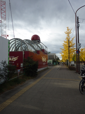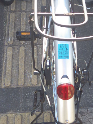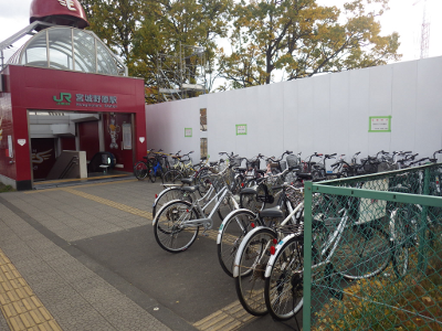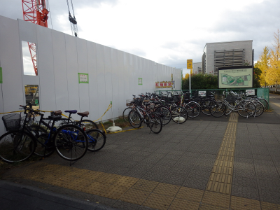 前日,点字ブロックの上に停めていた某医療・福祉系の専門学校を経営している学園のステッカーを貼った自転車は,この日は,点字ブロックの真上ではなく,駅出口の逆側のフェンスの真横の一番歩道よりの位置(写真右から2枚目の一番手前の自転車)に停めていた。この自転車の持ち主は,できるだけ歩道に近い位置に駐輪したいと考えているのかもしれない。