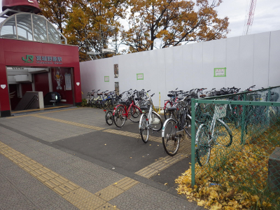 ,JRの関連会社の車を停めるために自転車を整理したことの影響か,この日は,駅入口から離れた側に密集して自転車が並べられている。そして,その場所の区切りとして,駐輪禁止を示すテープが機能しているように見えなくもない。