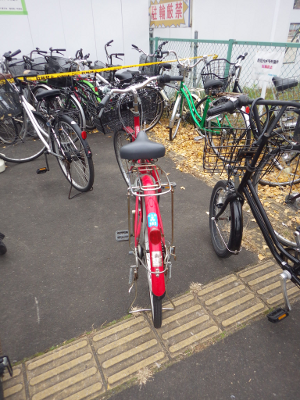 この日,点字ブロックの上に停められた自転車の中には,常連の宮城野高校のステッカーが貼られたものに加えて,「仙工高」と書かれたのステッカーが貼られたものがあった。
