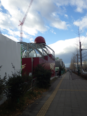 駐輪禁止を示すテープの張り方が,10月19日の張り方と同様で,駅から1本目の支柱はフェンスから自転車約1台分のスペースのところに,2本目の支柱は,フェンスと点字ブロックの中間あたりの位置に置かれている。駅から遠い側の支柱を手前に出すことで,違法駐輪の自転車をテープとフェンスの間に誘導しようという作戦のつもりなのだろうが,残念ながら,テープの手前側にも自転車が停められている。以前うまくいかなかった作戦が,ここにきて急に,うまくいくようになるとは,とうてい思えない。