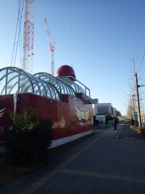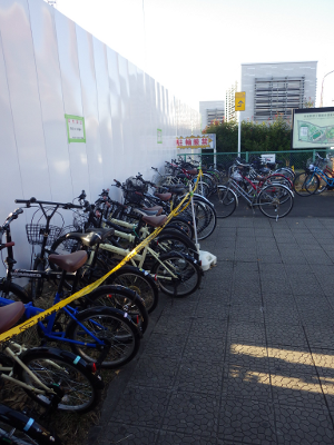 駐輪禁止を示すテープの張り方が,11月26日頃の張り方である,フェンスから自転車1台分のところに一直線で張る方法へと戻っている。この日は,テープが張られている範囲内では,自転車はテープよりフェンス側にのみ駐輪されていた。一応,結界の機能は果たしているようだ。