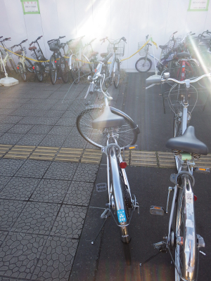 点字ブロックの上に停められた自転車の中には,常連である宮城野高校のステッカーが貼られた自転車に加えて,仙工高のステッカーが貼られた自転車もあった。