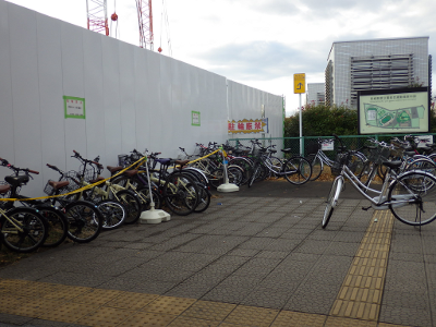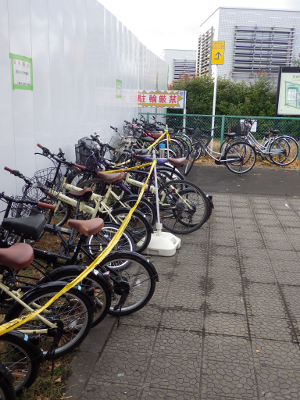 駐輪禁止を示すテープの張り方は,この日も先週末と同じままで,フェンスから自転車1台分のところに一直線に張られている。この日は,自転車の数が少なかったこともあるのか,テープが張られた範囲については,テープの手前側には自転車は停められていなかった。