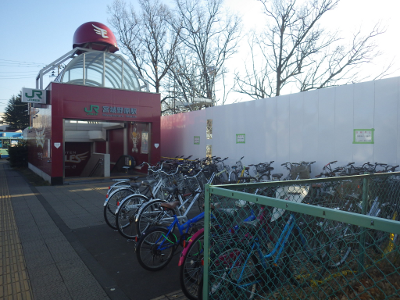 駐輪禁止を示すテープは,12月15日と同様で,駅から1本目の支柱はフェンスから自転車約1台分のスペースのところに,2本目の支柱は,フェンスと点字ブロックの中間あたりの位置に置かれている。さすがに,前日のままにしておいてはまずいということに,気が付いたのだろう。その結果,テープの手前側に置かれた自転車の数は,前日と比べて,明らかに少ない。
