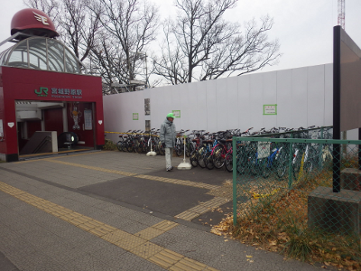 仙台市委嘱の自転車誘導員が駅前に立っていたこの日,宮城野原駅前に違法駐輪された自転車の数は,明らかにいつもより少なかった。そして,点字ブロックの上に置かれた自転車は皆無である。毎度ながら,自転車誘導員の影響力は大きい。