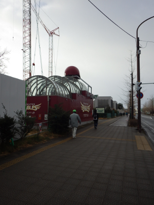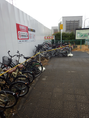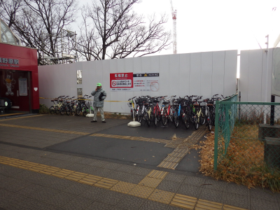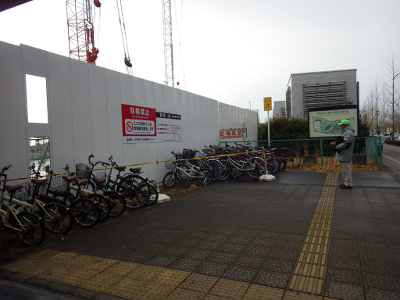 御用始めから2日目のこの日,宮城野原駅前には,仙台市委嘱の自転車誘導員が立っており,さらに,工事現場の仮囲いには新たな看板が設置されていた。どちらが主要因であるか,現時点では特定できないが,この日,駅前に違法駐輪された自転車の数は,昨年末と比べて,明らかに少なかった。そして,点字ブロックの上に置かれた自転車は皆無であった。