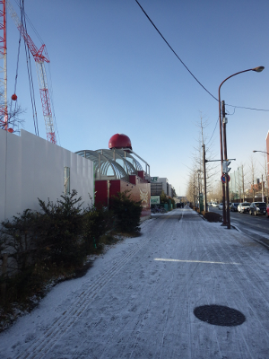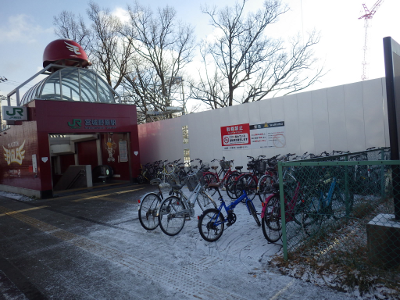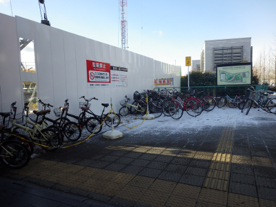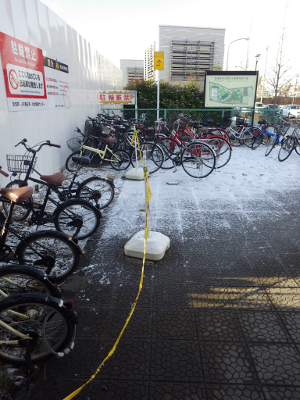 街がうっすらと雪化粧したこの日,宮城野原駅前の違法駐輪の自転車の数は,さすがにいつもよりは少なった。点字ブロックの上に置かれた自転車の数も5台と,いつもよりは少ない。