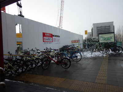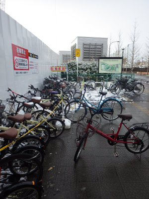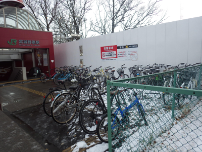 依然として雪化粧が続いているこの日,宮城野原駅前の違法駐輪の自転車の数は,いつもよりは少なかった。それでも,点字ブロックの上には4台の自転車が置かれていた。
