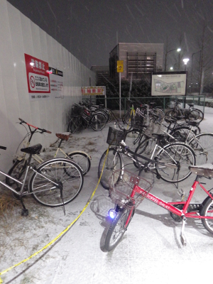 センター試験2日目のこの日,雪が降る朝6時に宮城野原駅に到着した時点で,駅前に違法駐輪された自転車の数は,前日と同程度であった。点字ブロックの上に停められた自転車は2台であった。