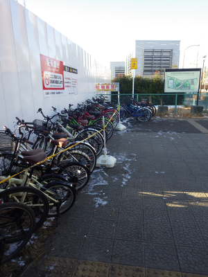 駐輪禁止を示すテープの支柱は,この日は2本とも仮囲いから自転車1台分の位置に建てられていた。そして,テープの手前側に置かれた自転車は,無かった。