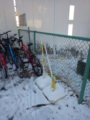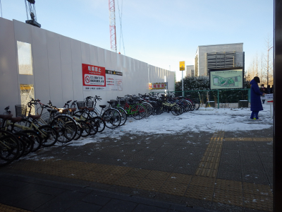 前日同様,仮囲いから自転車1台分位のところに張られていた駐輪禁止を示すテープの支柱は,駅入口と逆側のフェンスの前に,ひっそりと置かれていた。また,紐で縛られた自転車は,1月14日から変わらず,そのまま放置されていた。