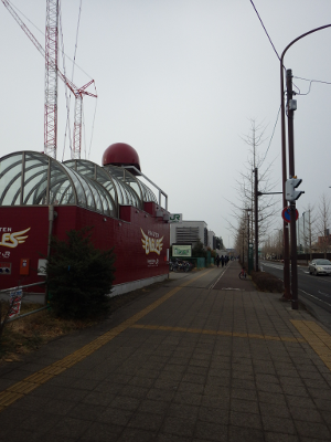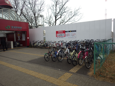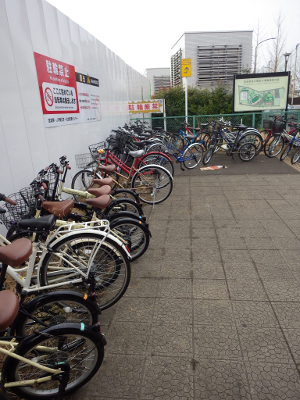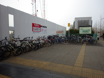 駐輪禁止であることを示すテープは,相変わらず,撤去されたままだが,自転車の置かれ方は撤去前と変わらない。むしろ,仮囲いから1列しか自転車が置かれていなスペースがいつもより広く,撤去前よりも良いと言えるかもしれない。