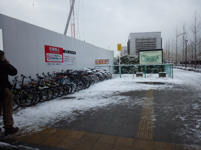 自転車の数が少ないため,この日の自転車の置かれ方は,仮囲いに沿って自転車1台ずつ並べられているだけだ。