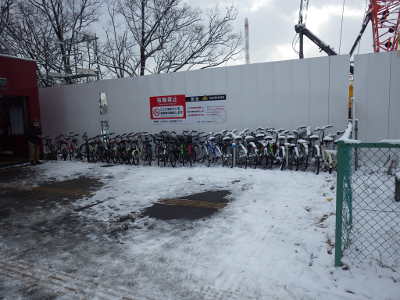 紐で結ばれた自転車は,未だに,ここに放置されたままである。これらの自転車の上に積もった雪と,他の自転車の雪を見比べると,他の自転車のほとんどは,今朝,ここに置かれたものである可能性が高そうだ。さすがに,これだけ道が凍ると,自転車を利用する人が少ないようだ。